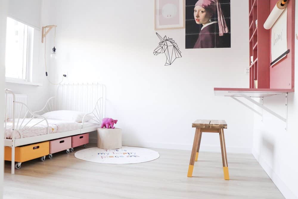 Onder haar bed verschuilen zich 3 houten kistjes, gekocht bij de bouwmarkt. Ik verfde deze in de kleuren waarvan ik nog wat verf over had en schroefde er wieltjes onder. (ook ikea..) Ideaal voor rondslingerend speelgoed!