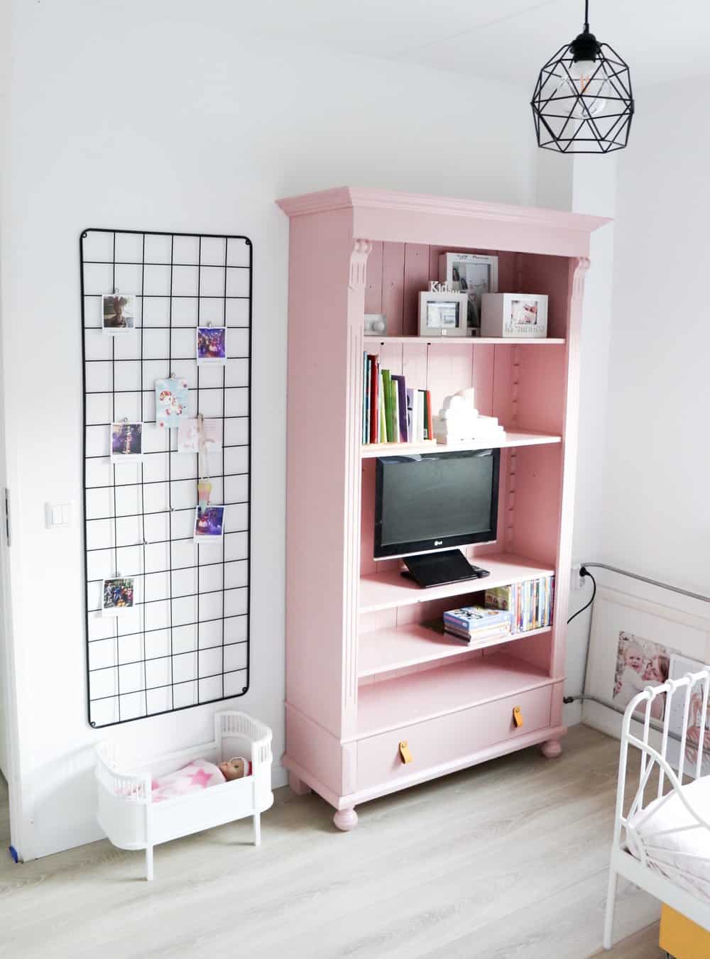 In onze kantoorruimte beneden hadden we nog een leuke boekenkast, die ik oud roze schilderde en opleukte met leren handgreepjes. Het tvtje hadden we nog over van de jongens. Er zit alleen een mogelijkheid op om dvdtjes te kijken hoor, no worries.