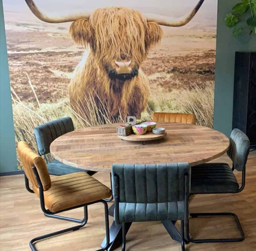 Tip 3: Creëer een statement in je woonkamer! Zorg voor een heuse eyecatcher waar mensen naar willen blijven kijken. Zoals bijvoorbeeld dit fotobehang van een levensgrote Schotse Hooglander waarbij je de natuur letterlijk in huis haalt. Of je woonstijl nu modern, industrieel of Scandinavisch is, dit behang kan altijd! En kijk waar je kinderen je bij kunnen helpen, die van mij hebben bijvoorbeeld het vorige behang er mee vanaf gehaald. Wat de kinderen helemaal leuk vinden is om op het oude behang te tekenen, dus laat ze de dag ervoor lekker los gaan met dikke stiften. Het zorgt gegarandeerd voor uren plezier.