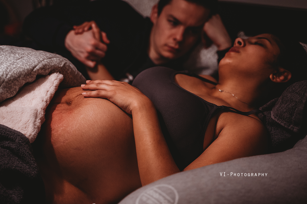 Ik pakte mijn spullen en stapte de auto in. De snelweg was leeg en de kerstmuziek knalde uit mijn speakers. Ik had zo’n zin in deze bevalling! Even na 19.00 uur kwam ik binnen bij Danitsha en Erik. Danitsha lag volledig in haar bubbel op bed haar weeën op te vangen, met op haar rug een Tens. Haar buik spande zo hard aan tijdens een wee, dat ik dacht: “Dit lijkt gewoon bijna al op persdrang”. Ze bleef zuchten en zuchten. Tot ineens haar hele buik mee ging doen. Jeetje, wat gaat dit snel!