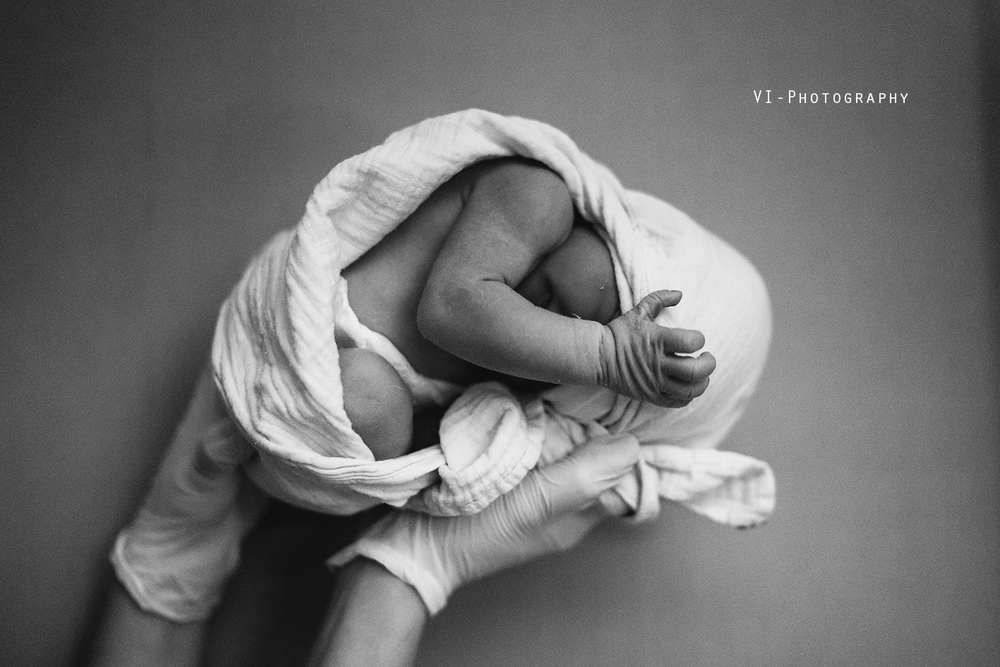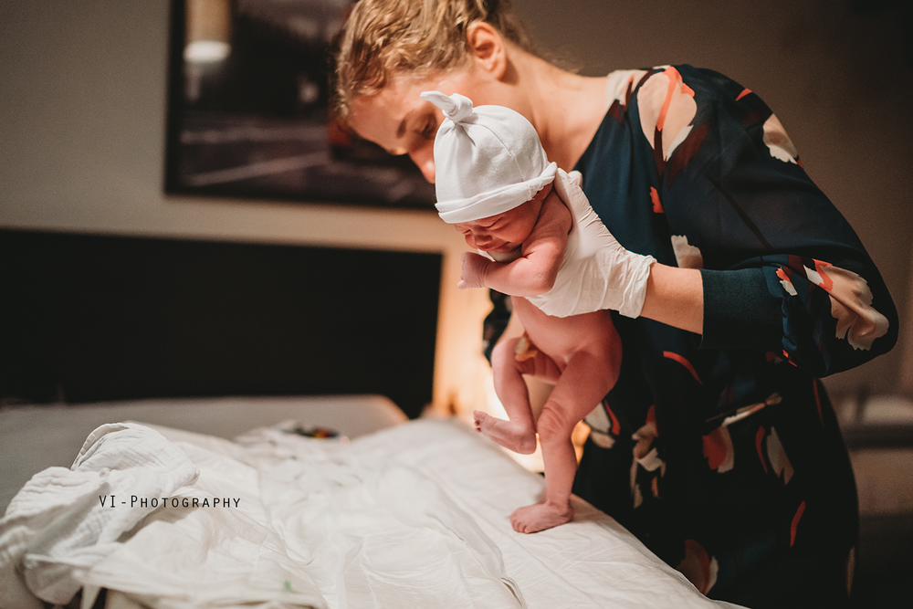 Toen het hoofdje stond, keek Danitsha met een spiegel mee. Het meest pijnlijke moment, maat die lach op haar gezicht wad onbetaalbaar. Wow. Vrouw. Wat een kracht! De volgende wee werd er een klein meisje geboren met haar handje naast haar gezicht, zoals ze ook al die tijd in de buik had gezeten. Niet de makkelijkste houding, en vaak ook niet zonder schade bij moeder, maar ze was er! Ze proeste een paar keer, maar wilde nog niet huilen. De verloskundige stimuleerde haar door te wrijven, tegen haar voetje te tikken en ze kreeg een mutsje op. Na wat minuten die in mijn hoofd uren leken te duren, ging ze dan toch huilen. Papa en mama mochten haar naam hardop zeggen: Noéla! Betekenis: kerstmis! Wow, wow, wow. Wat mega bijzonder zo op Eerste Kerstdag! Wat een cadeautje.