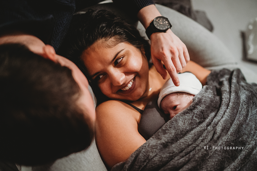 Net na het starten met persen, kwam ook de kraamzorg binnen. Het kindje zat al zo laag, dat we eigenlijk na twee keer persen al een stukje van het hoofdje konden zien. Erik, die zich nog zo had voorgenomen niet te kijken, keek toch vol verwondering mee. Zijn ogen straalden van trots en hij hielp Danitsha zo goed door de weeën heen. Het mee mogen persen voelde fijn voor Danitsha. Ze kon eindelijk iets met die weeën. Toen het hoofdje bijna stond, vroeg de verloskundige of ze even wilde voelen. Ze hielp de hand van Danitsha naar de juiste plek en er verscheen een glimlach van oor tot oor toen ze het glibberige hoofdje met zwarte haartjes onder haar hand voelde. Dit moment, ik gunde het elke moeder. Het geeft je zo’n boost, zoveel kracht. “Je bent er bijna mama!”, dacht ik.