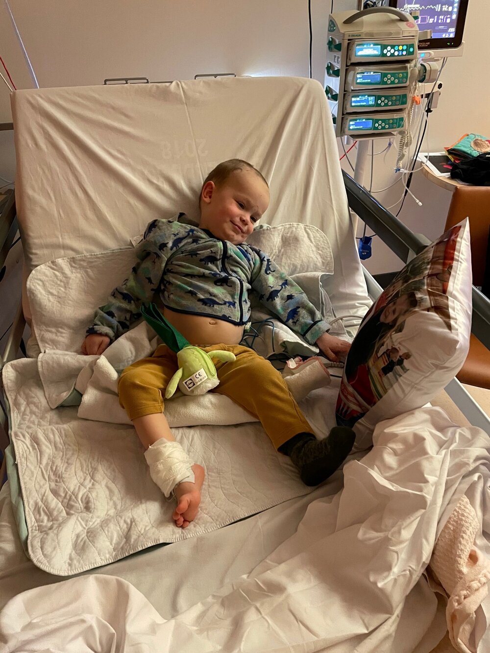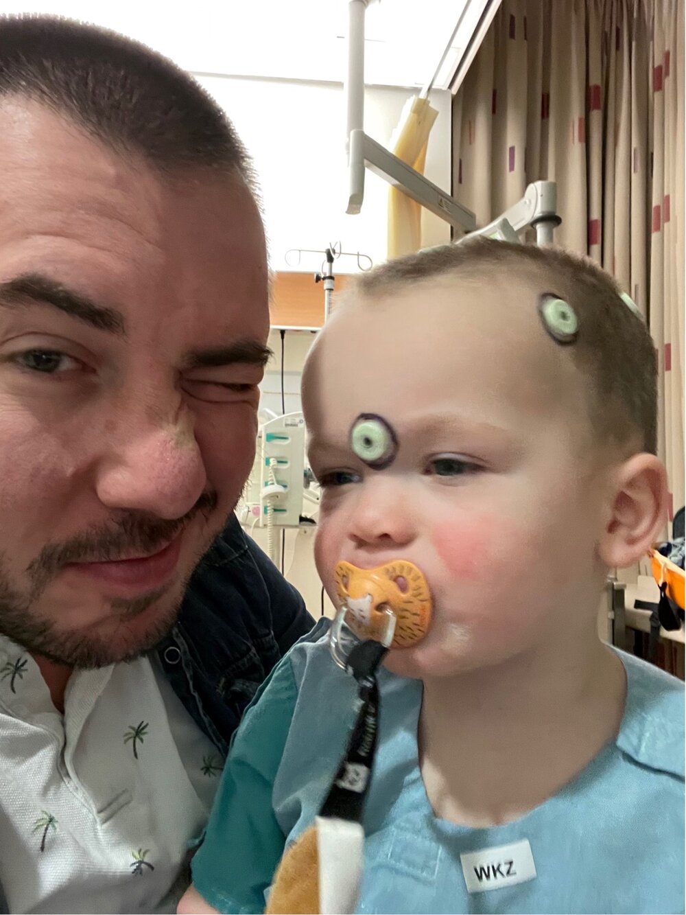 Ontwaken op de IC duurt lang. Pas in de loop van de avond wordt onze kleine man een beetje wakker in een eigen box waar we dichtbij hem kunnen blijven. Hij voelt zich ontzettend rot. De zwelling neemt toe en veroorzaakt steeds meer misselijkheid, iets dat de dagen na de operatie alleen maar verder zal toenemen. Hij is oncomfortabel door pijn en medicatie hiertegen wordt opgeschroefd. We wisten vooraf dat we op de IC konden blijven, maar realiseren ons steeds meer dat er van slapen weinig sprake zal zijn. Mathis blijft vooralsnog het rustigst als hij één van onze handen vast kan houden. Ik waak naast hem en houd zijn kleine handje vast, terwijl mijn vrouw wat probeert te slapen. Om 3u ’s nachts wisselen we, zodat ik ook even een paar uurtjes kan slapen.