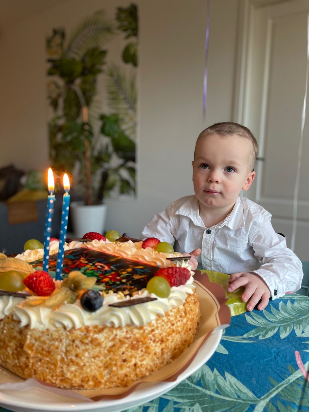 Vandaag is een bijzondere dag, want Mathis wordt 2 jaar. Iedere ouder zal op dit soort momenten terugblikken op de afgelopen jaren en bepaalde momenten. Die van ons worden weliswaar vertroebelt door verschillende ziekenhuisopnames, maar er zijn ook veel mooie en fijne herinneringen. Terugbladerend door foto’s zijn we blij en verdrietig tegelijk. Desalniettemin hangt de naderende operatie constant in de lucht. Het is er altijd. De spanning neemt toe. Zonder bezoek en feestelijkheden bedenken we vooraf wat ons blij maakt om ter ere van zijn verjaardag te doen. We besluiten de polikliniek kinderneurologie en de afdeling 1-Noord van het Sophia Kinderziekenhuis, Mathis’ vaste ziekenhuis en team van behandelaren, te verrassen met taart. Deze plek is zo bijzonder en belangrijk voor ons geworden. We kennen er de weg en de mensen. Zelfs de dames aan de telefoon op de poli kennen Mathis’ naam. Ik breng de dag voor zijn verjaardag de taart zelf langs, veel bekende gezichten en lieve woorden. Er is zelfs de moeite genomen een cadeau voor hem te regelen. Eén van zijn vaste verpleegkundigen heeft gezorgd dat ze even weg kan van de afdeling die ochtend. We praten uitgebreid over de afgelopen en aankomende spannende periode. Het heeft ons erg geholpen en sterkt ons nog steeds ontzettend te ervaren dat er zo veel mensen aan ons en Mathis denken en er zijn wanneer dat nodig is! Op Mathis’ verjaardag eten we taart en worden er veel cadeaus uitgepakt! Het verdriet mag er zijn, zoals altijd, maar voert vandaag even niet de boventoon.