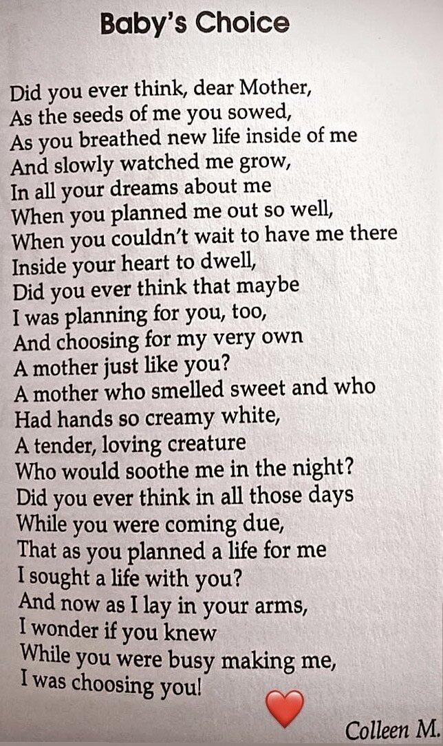 Dit gedicht kwam ik tegen op internet en beantwoordde de vraag die ik vorig jaar had: Waarom ik? Omdat Jane mij heeft uitgekozen om haar moeder te zijn.