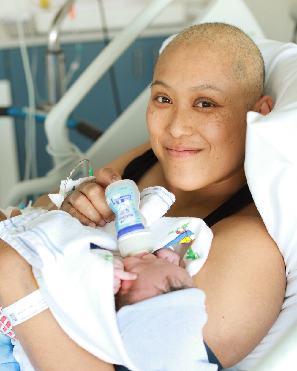 Na de intake en het zetten van een infuus was het zover. Ik was de volgende die naar de OK mocht. Steunkousen en operatiepak aan. Mijn pruik af. Daar gingen we. Ondanks de COVID-19-perikelen mocht mijn man er godzijdank bij zijn. De operatiekamer is warm en er staan een stuk of acht mensen klaar. Ook tref ik mijn man weer, dit keer in beschermende kleding inclusief hoofd- en mondkapje. Ik voel de naald van de verdoving in mijn rug glijden. Een onprettig gevoel, maar te doen. Hierna is het wachten tot de verdoving zijn werk doet. Het is overweldigend wat er allemaal om mij heen gebeurt en de gedachte wat er over een paar minuten gaat gebeuren nog veel meer. Terwijl de twee gynaecologen bezig zijn om mijn buik open te snijden, maak ik grapjes waar vooral ik zelf heel hard om moet lachen. Ik wil namelijk niet denken aan alle negatieve dingen die zouden kunnen gebeuren. Na letterlijk twee minuten horen we aan de andere kant van het operatiescherm dat ze zover zijn. Het doek wordt naar beneden gehaald en na een goede duw in mijn buik voel ik ineens een leegte en hoor ik een voorzichtig huiltje. Het lachen en de grapjes zijn me binnen een nanoseconde vergaan. Alle spanningen en zorgen van de voorafgaande drie maanden komen er uit. Ik durf het bijna niet te geloven, maar ik heb gewoon een levende en gezonde baby op de wereld gezet, terwijl mijn lijf werd volgepompt met chemokuren. Door het scherm zie ik een dikke roze baby die met gebalde vuistjes ter wereld is gekomen. Ze mag meteen op mijn borst liggen en ik fluister haar zacht toe dat het mij spijt wat ik haar heb aan gedaan en beloof haar dat ik probeer weer beter te worden, zodat ik de rest van haar leven bij haar kan zijn. Het moment is beladen, Ik lig huilend met een kale kop in een blauw pak met een nog opengesneden buik te midden van volslagen vreemden. Ik voel me zo ontzettend klein, maar tegelijkertijd ook zo dankbaar en blij: mijn dochter is gezond.