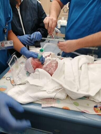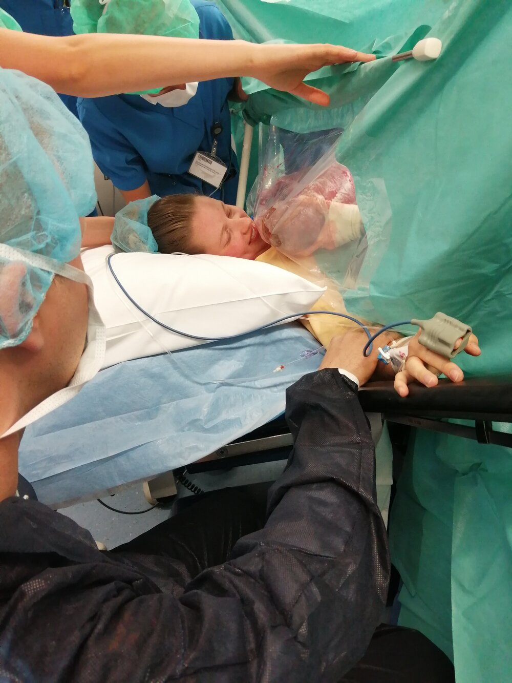 Ik heb vannacht ontzettend slecht en onrustig geslapen. Man, wat ben ik zenuwachtig voor vandaag. We moeten ons om 6:15 uur melden bij de verloskamers. Daar word ik gereed gemaakt voor de keizersnee. Er wordt bloed geprikt en een infuus geplaatst. Ik krijg een katheter en dan is het wachten tot de CTG af is. Om kwart voor 8 mogen we naar de operatiekamer. Daar word mijn man klaar gestoomd om opnieuw papa te worden. Hij krijgt een doktersmuts op en een heel pak aan. De zuster grapt nog: “Maatje M denk ik?” Dat gaat natuurlijk nooit passen. Er worden nog foto’s gemaakt van ons samen en dan vertrekken we naar de operatiekamer. Als de ruggenprik zit, voel ik mij opgelucht en redelijk ontspannen. Ik ben reuze benieuwd naar onze baby en hoop dat alles voorspoedig verloopt. Gelukkig is ons kindje er al binnen een kwartier. Het gaat zo snel. Ik mag Noud bewonderen door het operatieluikje. Hij laat direct van zich horen. Hij huilt! Wat goed! Ik ben opgelucht, want dit doet hij in ieder geval goed. Mijn man loopt met hem mee naar de kinderartsen en daar kijken ze hem helemaal na. Als alles goed gaat, wordt hij direct slapende gebracht en beademd. Ook papa moet hem loslaten, want hij wordt weggereden naar de operatiekamer. Min man zit weer naast mij, terwijl ik word gehecht. Als dit eenmaal klaar is, mag ik naar de uitslaapkamer.