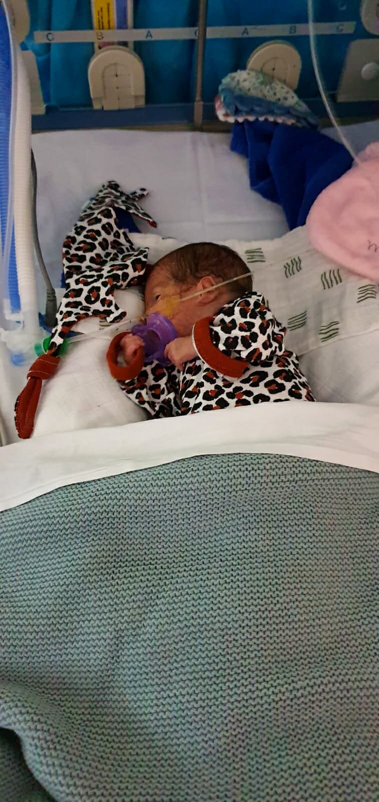 Om de drie dagen krijgt Maud schone kleertjes aan. We beginnen met maatje 36. Zelfs dit is nog wat te groot. Ze krijgt alleen een rompertje of truitje aan. Een broekje is te veel gesjor en daar wordt Maud moe van. Met 30,5 week gaat het afbouwen van de CPAP eindelijk beginnen. Maud kan dit aan! We zijn trots! We gaan naar 6.5, 6, soms weer een stapje terug, maar ze blijft goed stabiel op 6 liter. Na 5 weken mag Maud over op de optiflow, nadat hier al voorzichtig over gepraat werd. De optiflow lijkt op de CPAP, maar het zit wat minder ver in je neus. Laagdrempelig kan er altijd weer overgegaan worden op de CPAP. Maar, hoe trots kun je zijn. Ook dit doet ze heel goed en houdt ze prima vol!