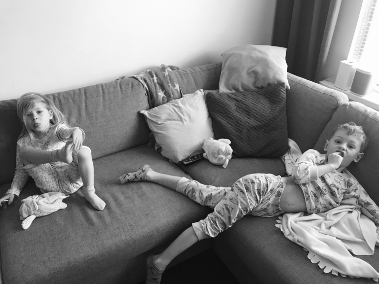 Of dat je dan zegt dat ze nog even moet slapen en ze dat beaamt, en jij dan weer naar bed strompelt met een hoofd dat continu door een moker wordt bewerkt, en dat dat duiveltje in mensgedaante, want dat is ze inmiddels in de waangedachten van het delirium waarin jij je begeeft, na 5 minuten begint te zingen en te roepen dat ze wakker is… en je er dan dus weer uit moet, nu voorgoed, terwijl je geest eigenlijk nog blijft liggen en je jezelf dus als een zombie voortbeweegt om dat monster uit bed te pakken dat toch om jouw aandacht vraagt. En dat je jezelf dan met dat wezentje naar beneden begeeft om daar samen onder een dekentje op de bank te kruipen en tv te gaan kijken. In pyjama, jij met thee en zij met haar melk, tussen de knuffelbeesten, dicht tegen elkaar aan … Dat is toch echt preciés wat je wilt na een nacht stappen?! Nee dus! Heel fijn hoor zo’n kleintje tegen me aan, maar ik vind het nóg fijner als dat een uurtje of 4 later gebeurt. Ook hier weer een shout-out naar de iPad op zulke momenten!