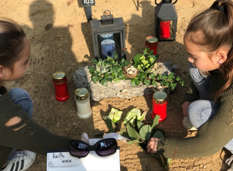 In de auto geef ik de meiden hun lijstje met een foto van hen drieën. Hun gezichtjes lichten op, maar tegelijkertijd worden hun oogjes natter en natter, tot daar het moment komt en de eerste tranen beginnen te rollen. Ik besluit hen hun moment te laten pakken en we rijden richting de begraafplaats.