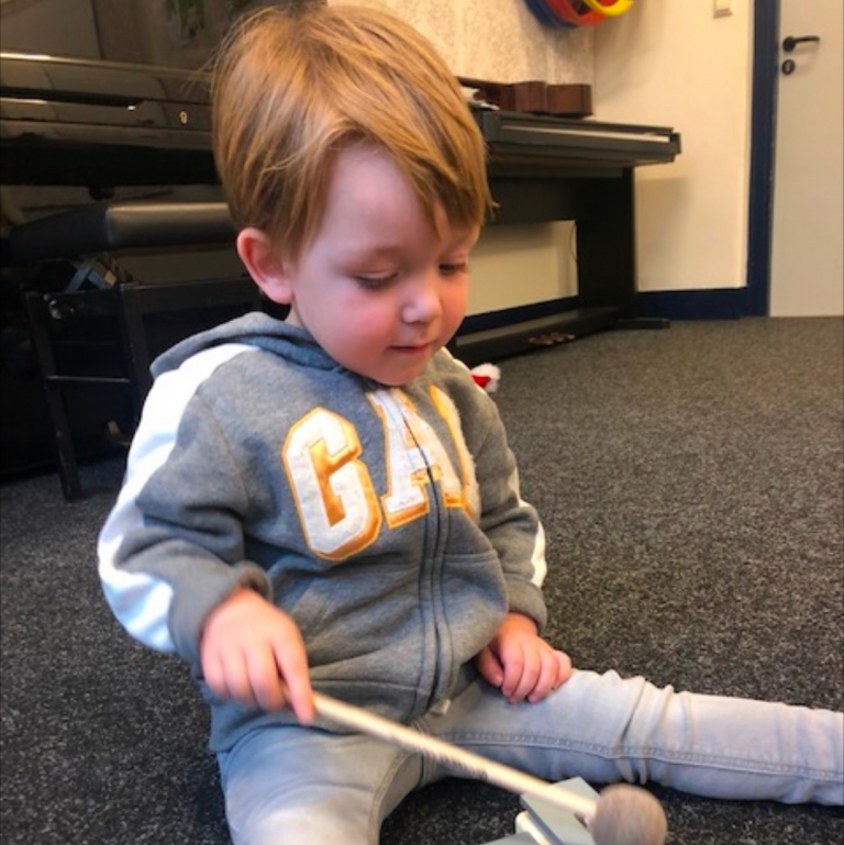 De wind doet het windmolentje die we een tijd geleden kwamen brengen mooi draaien en de meiden zien het ook.
